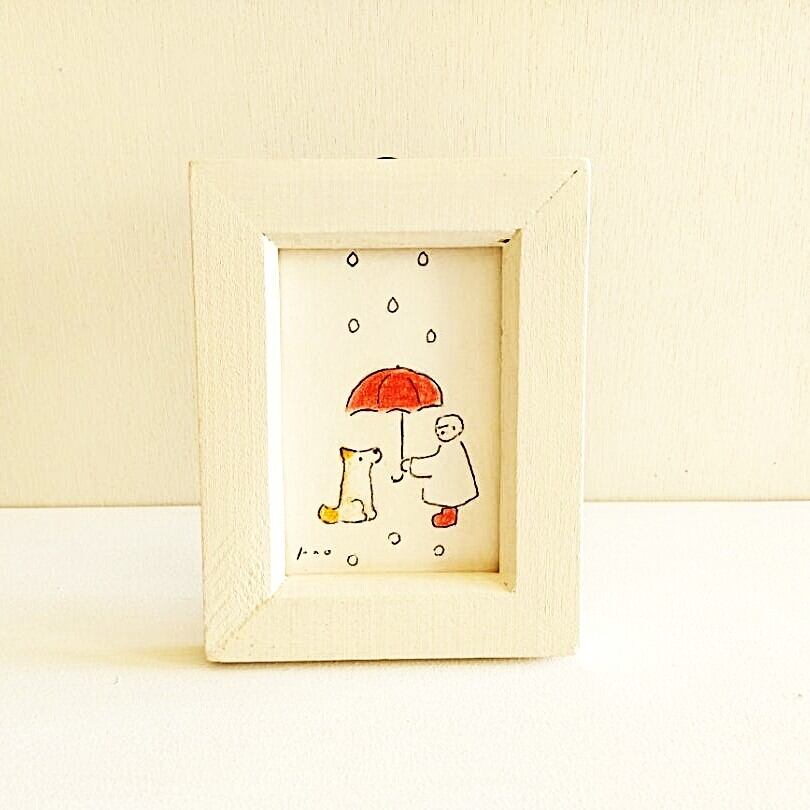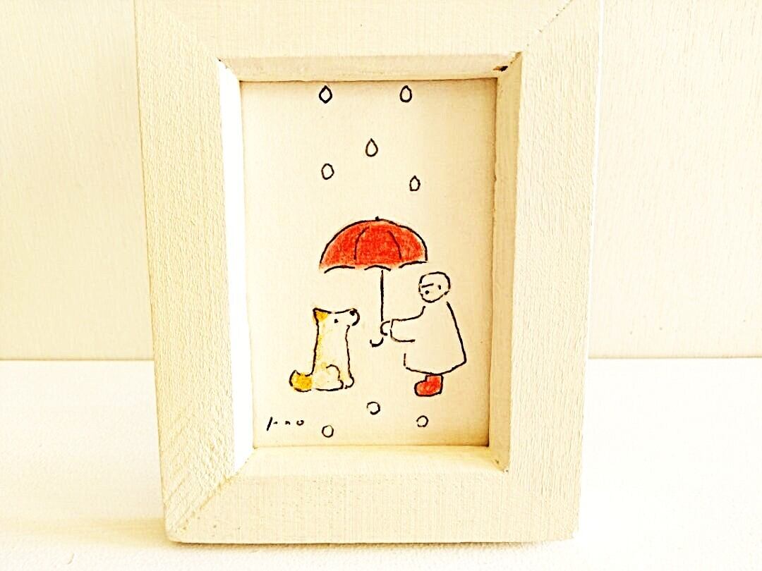 犬のイラスト「雨の日キミと」ミニ原画 ※木製額縁入り 再販