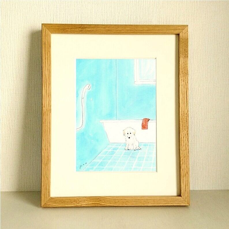 うちの子 オーダー|犬イラスト|水彩 原画「シャワーの日」 ※木製額縁入り(インチサイズ)受注制作