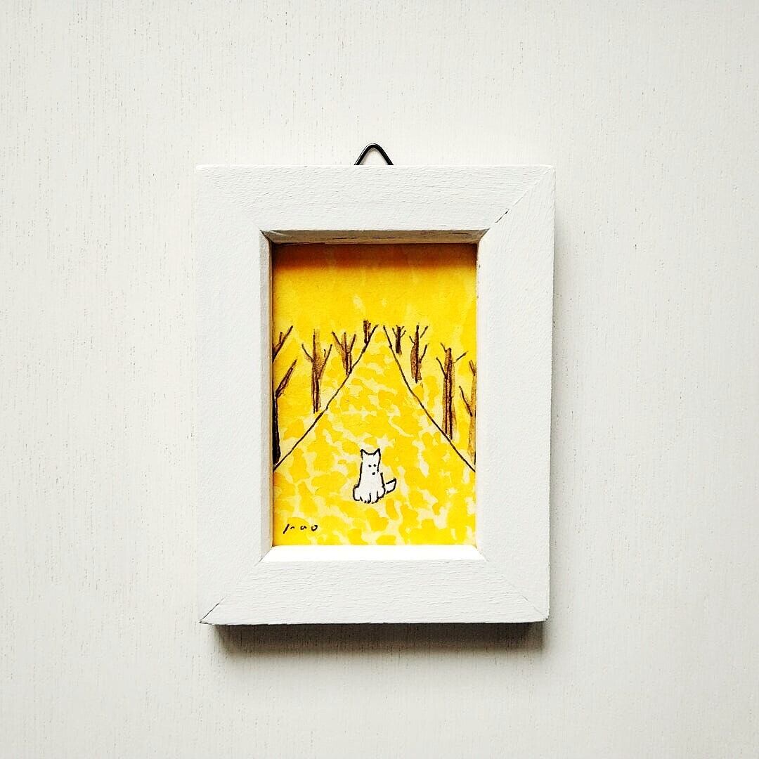 犬イラスト|原画|「イチョウ並木」 ※木製ミニ額縁入り