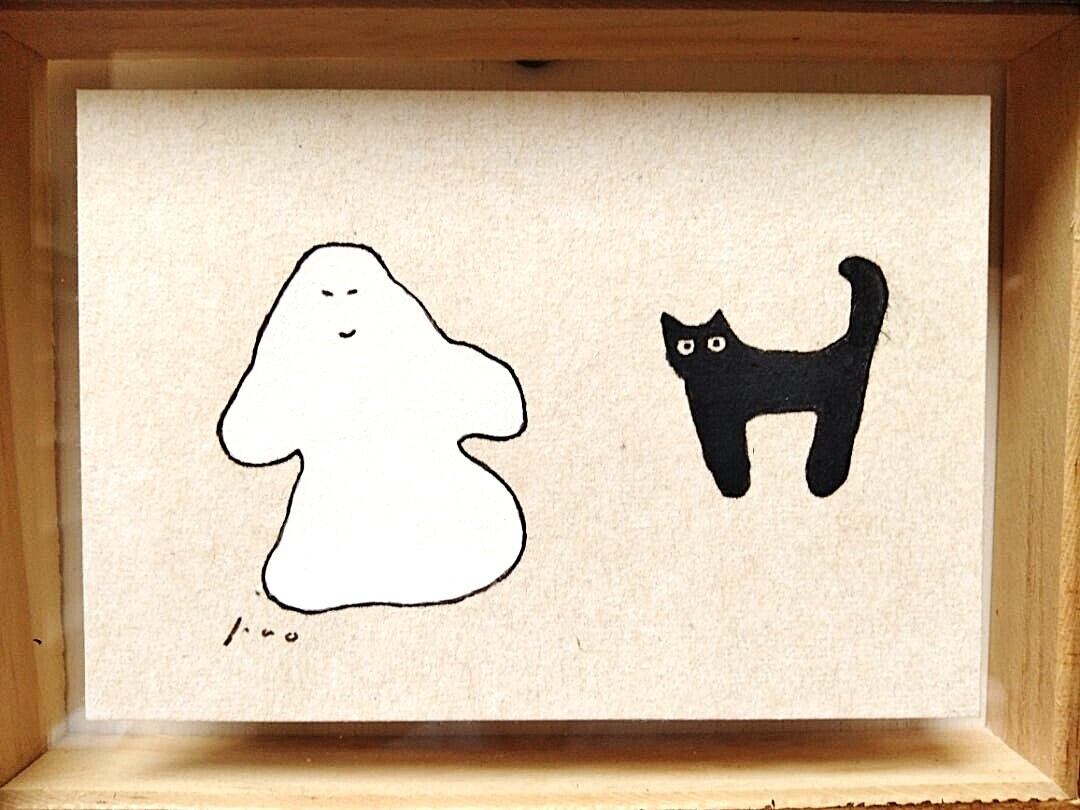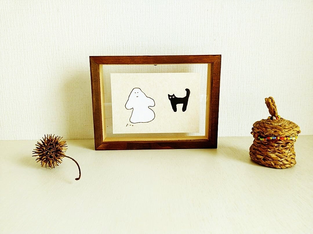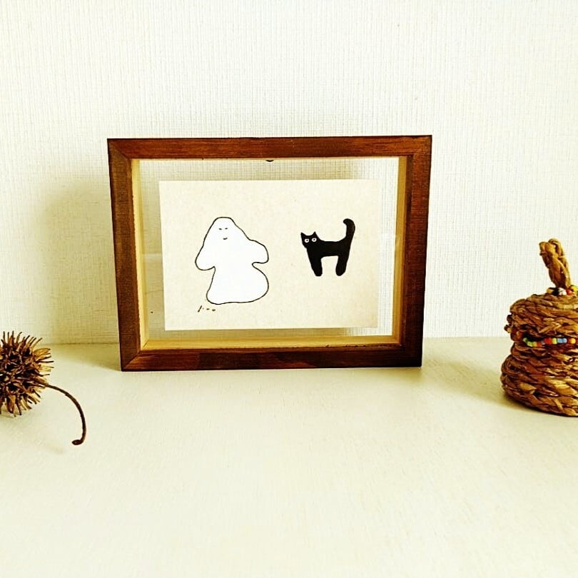 ハロウィン イラスト|原画 「おばけと黒猫」※木製額縁入り インテリアアート