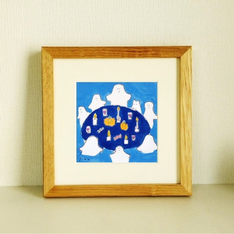 イラスト 原画「ハロウィンパーティー」 ※木製額縁入り (18㎝角)インテリアアート