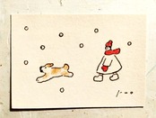 シンプルな構図で描いた犬と女の子の絵です。雪に喜び走る犬。