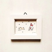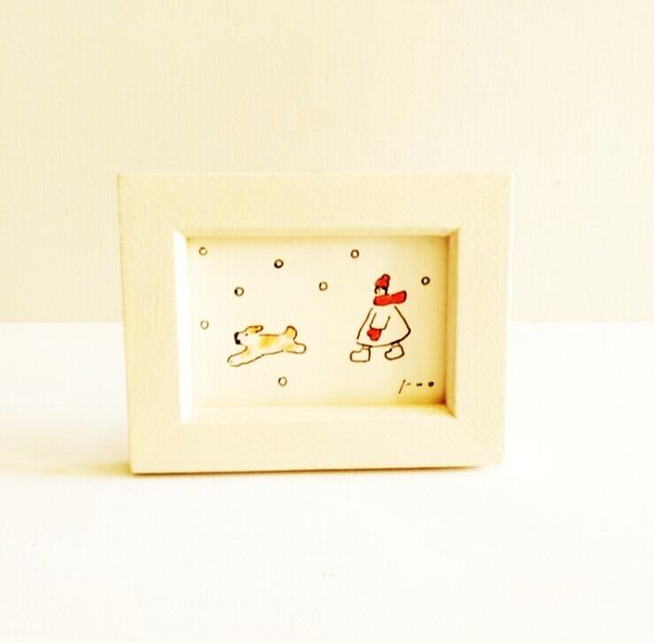 犬イラスト「雪の日の散歩道」原画 ※木製ミニ額縁入り インテリアアート