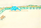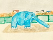 曇り空の下、少し寂しそうな水色の象に何かシンパシーを感じ、絵にしました。