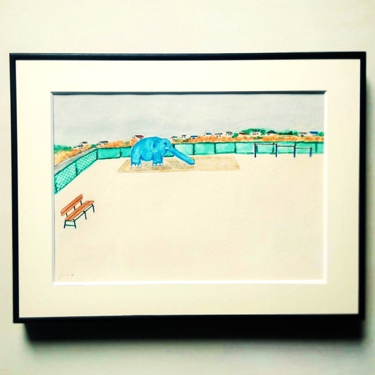 一点物|原画「青い象のいる広場」水彩 イラスト ※額縁入り(太子サイズ)