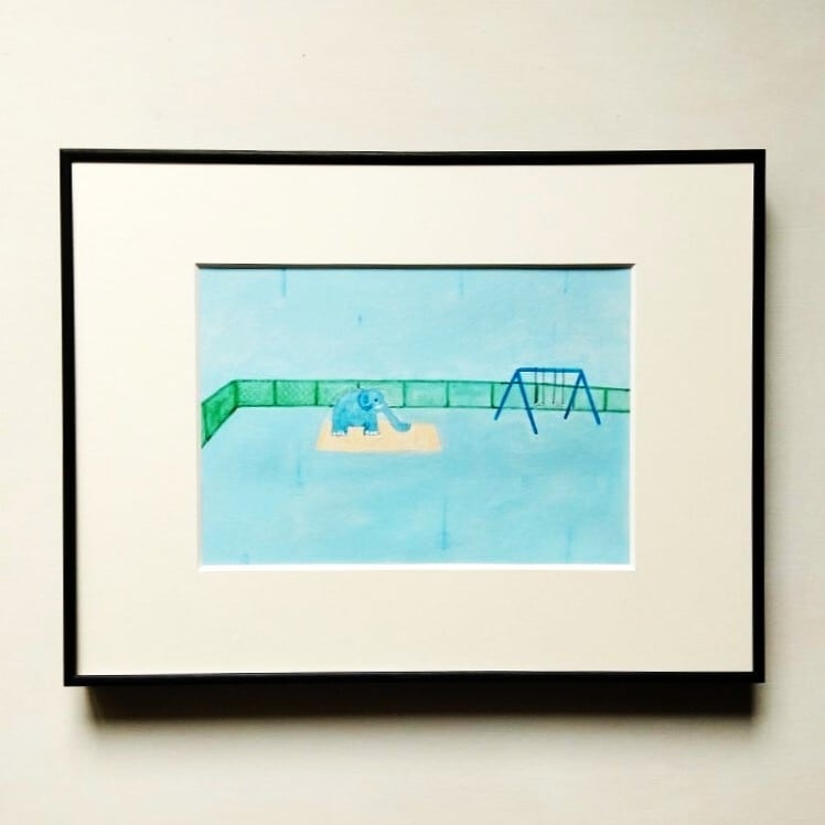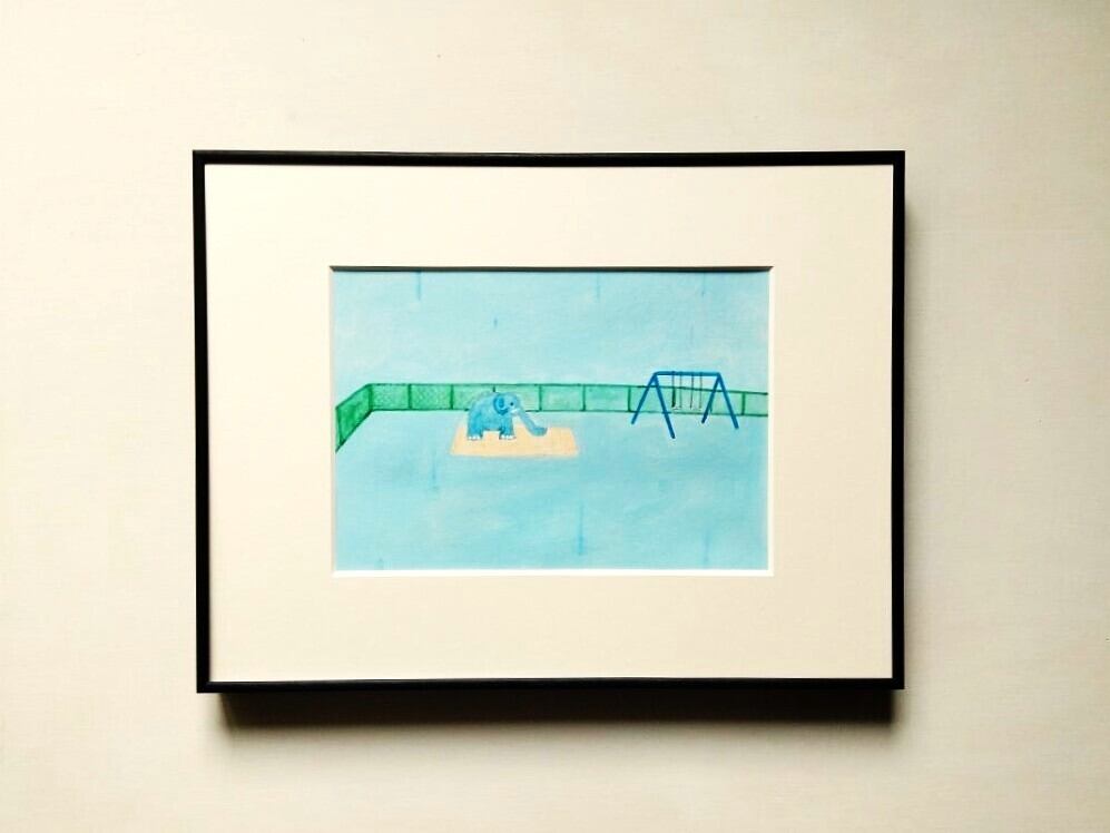 曇り空の下、少し寂しそうな水色の象に何かシンパシーを感じ、絵にしました。