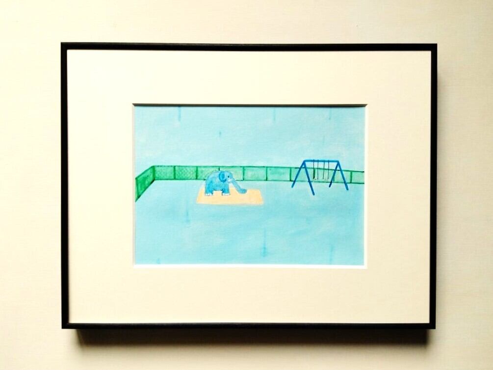 一点物|風景画|原画「青い象のいる広場2」水彩 イラスト ※額縁入り(太子サイズ)