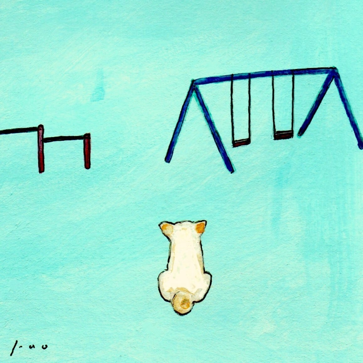 白い犬の背中。心が穏やかになるような、やさしい絵です。