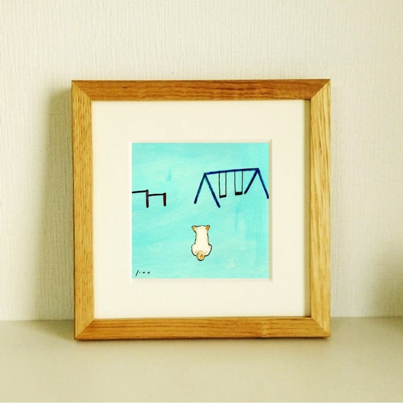 犬のイラスト「ブランコ」原画 ※木製額縁入り(18㎝角)インテリアアート