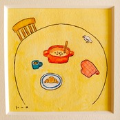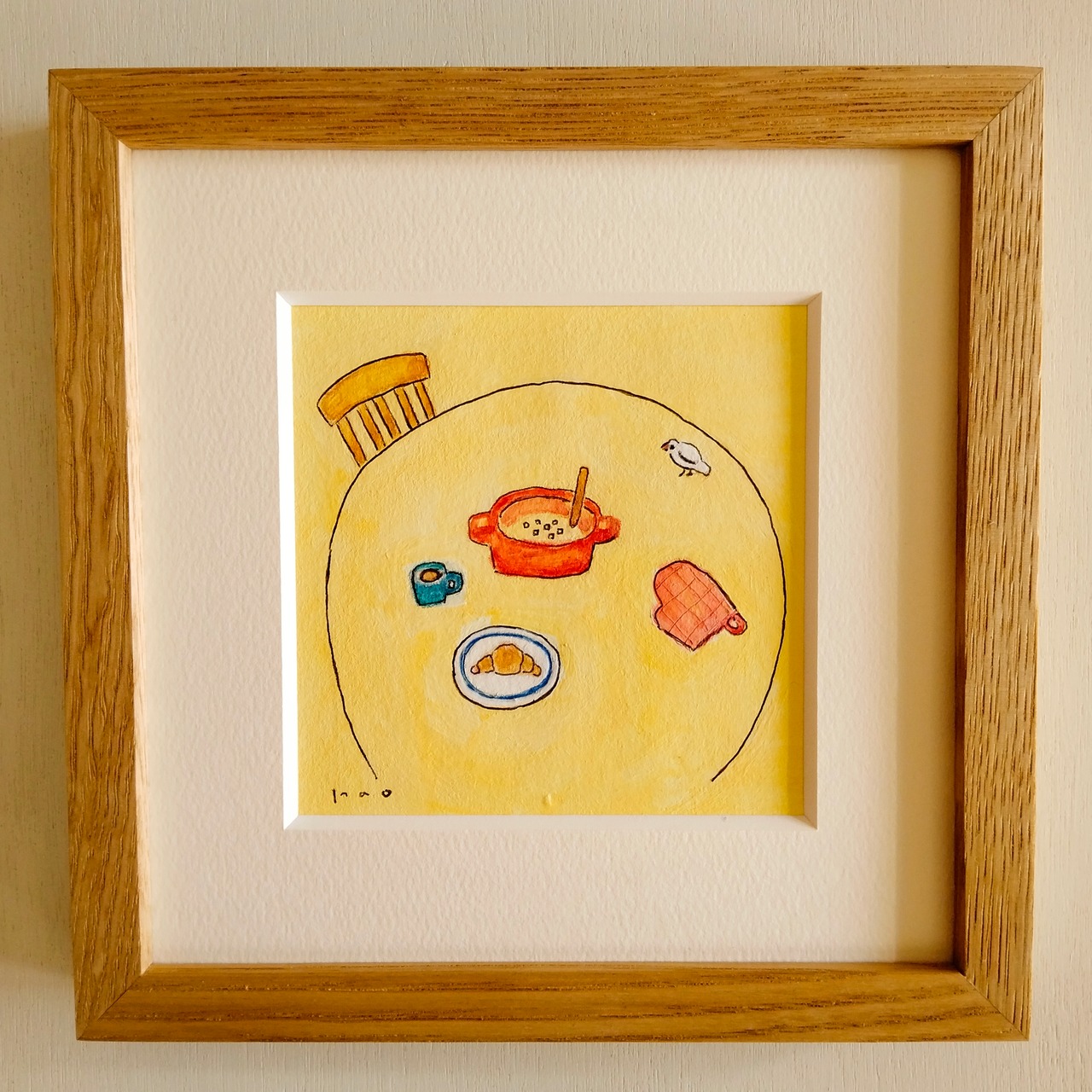 「朝の食卓」原画 ※木製額縁入り(18㎝角)一点物 水彩 イラスト 北欧インテリア