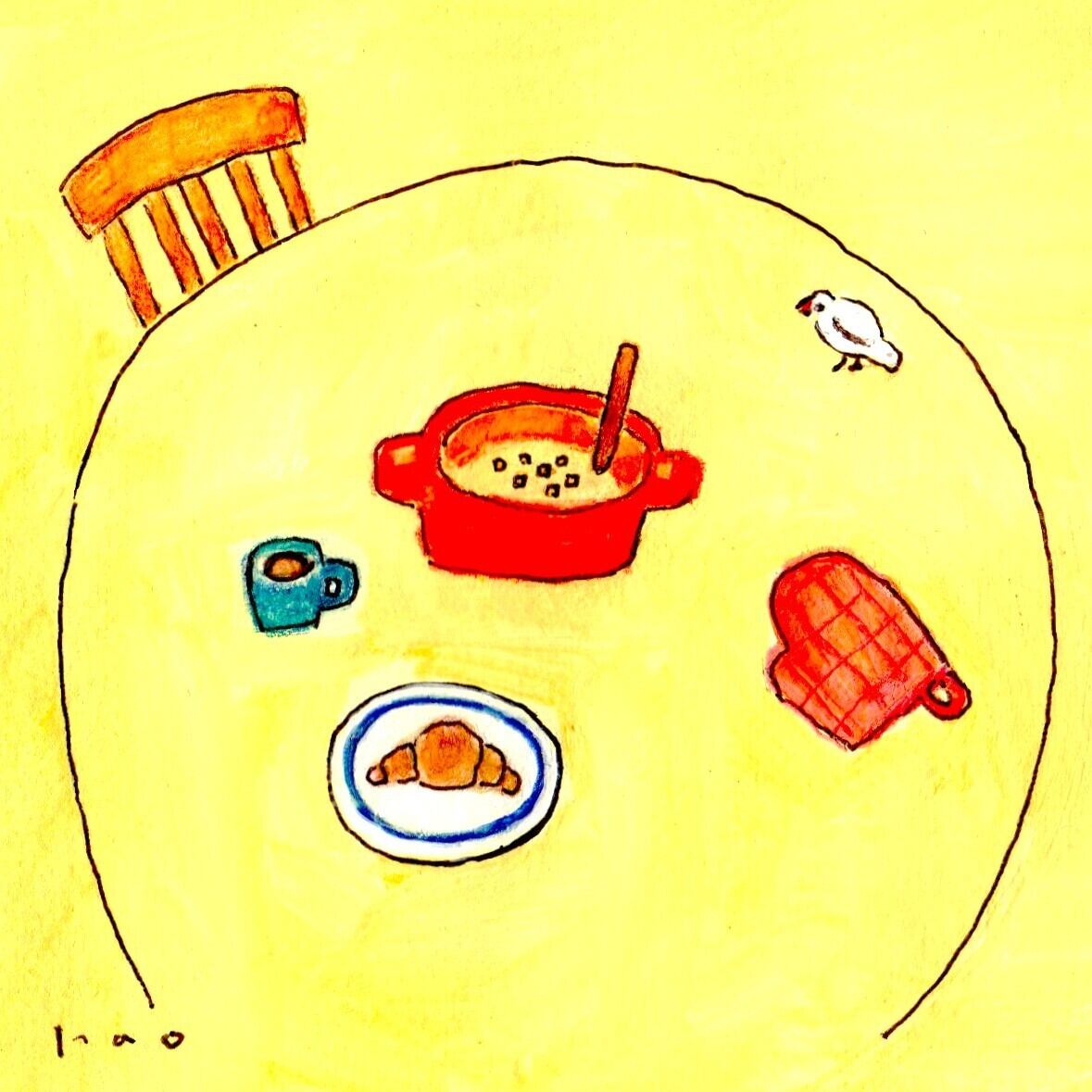 おいしいスープのある朝、あたたかな雰囲気の絵です。ギフトとしてもおすすめ◎