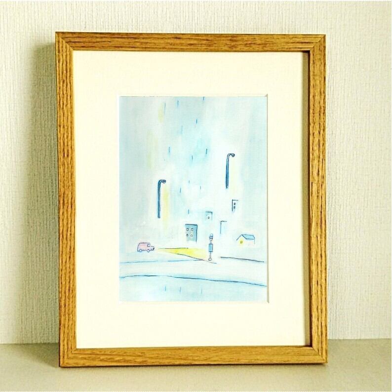 絵画|原画「雨のバス停で」水彩 イラスト※木製額縁入り(八つ切りサイズ)
