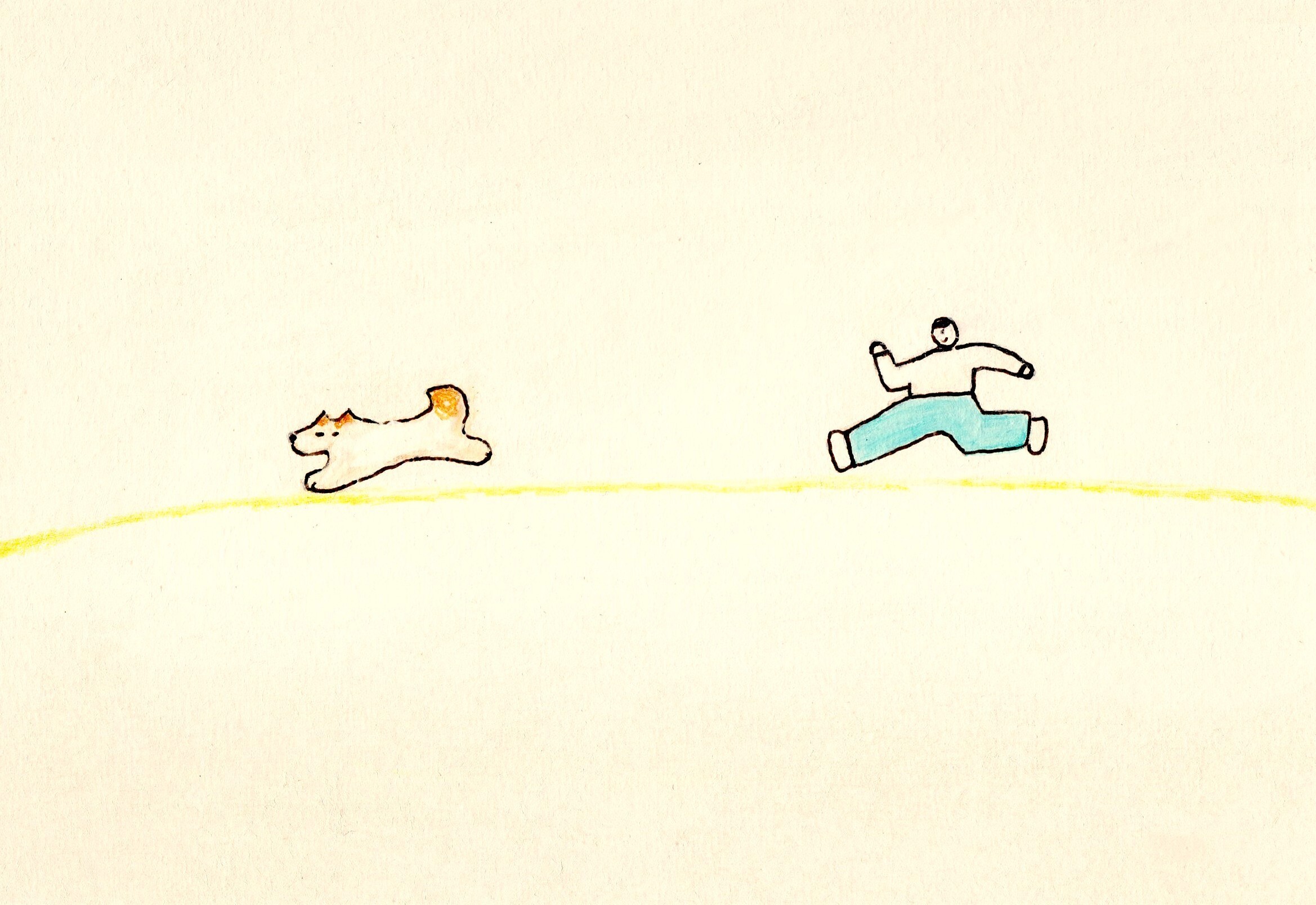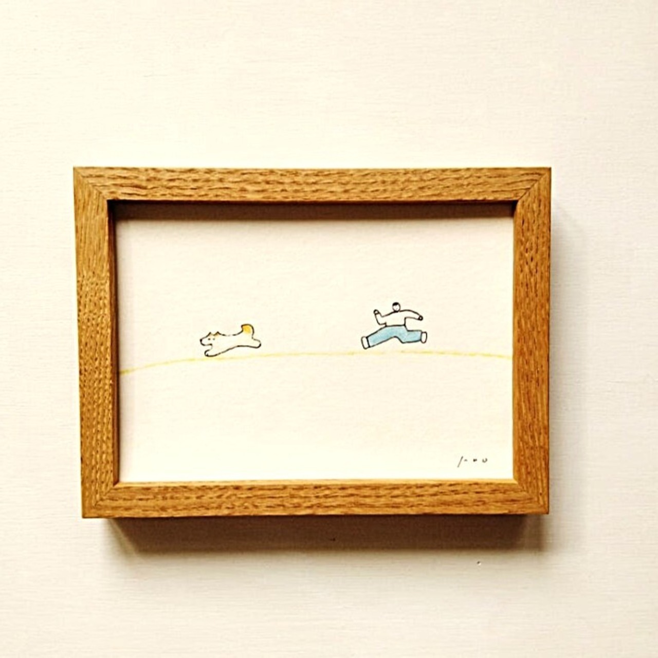 イラスト「追いかけっこ」 ※木製額縁入り(2Lサイズ)インテリアアート 犬イラスト 原画