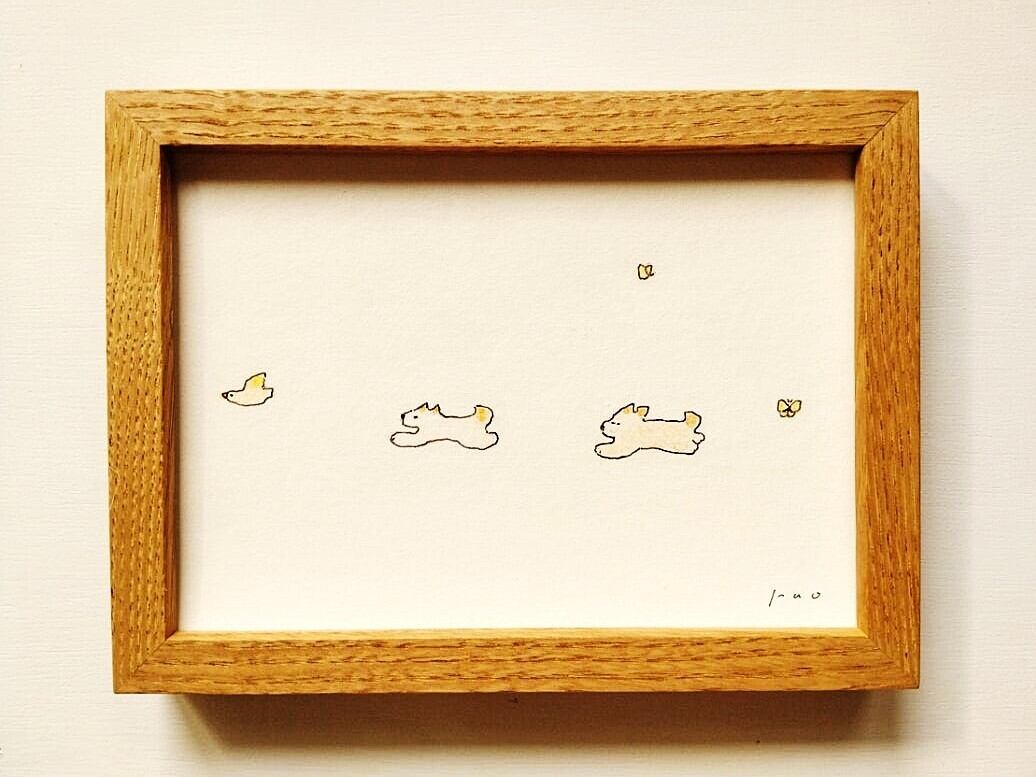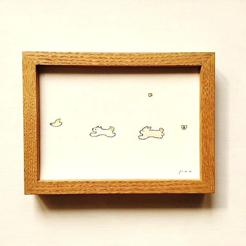 イラスト「追いかけっこ(鳥)」 ※木製額縁入り(2Lサイズ)インテリアアート 犬イラスト 原画