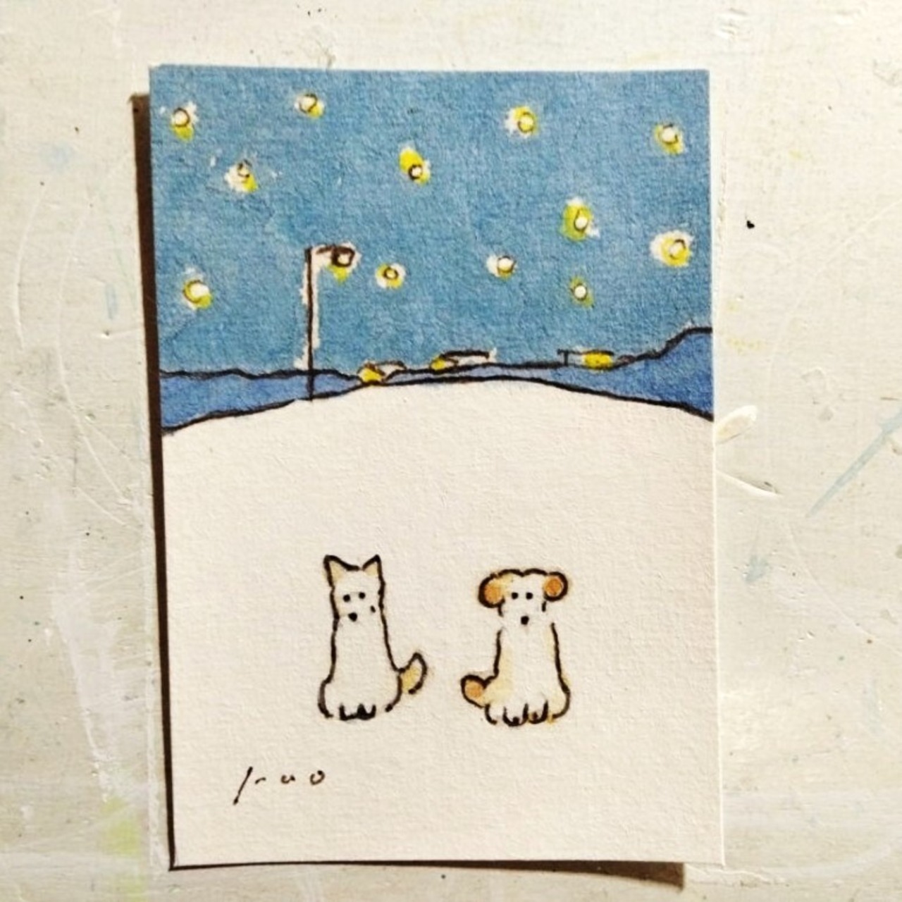 二匹の犬を描いたミニ原画。