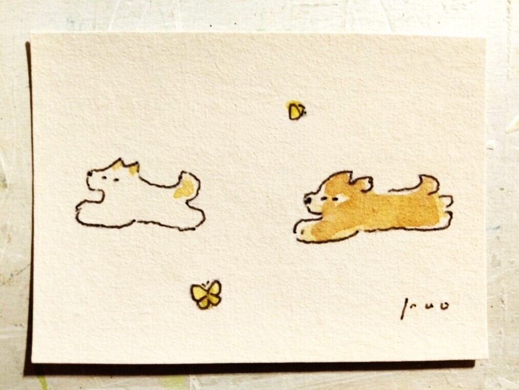 2匹の犬を描いたミニ原画。