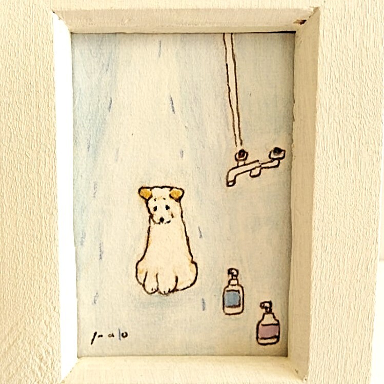 イラスト 原画 「シャワーの日」※木製額縁入り インテリアアート 犬のイラスト ミニ原画