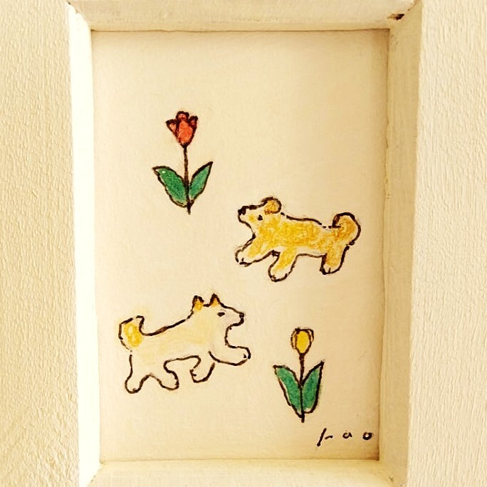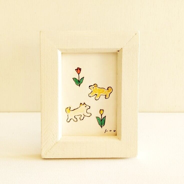 イラスト 原画 「チューリップ」※木製額縁入り インテリアアート 犬のイラスト ミニ原画