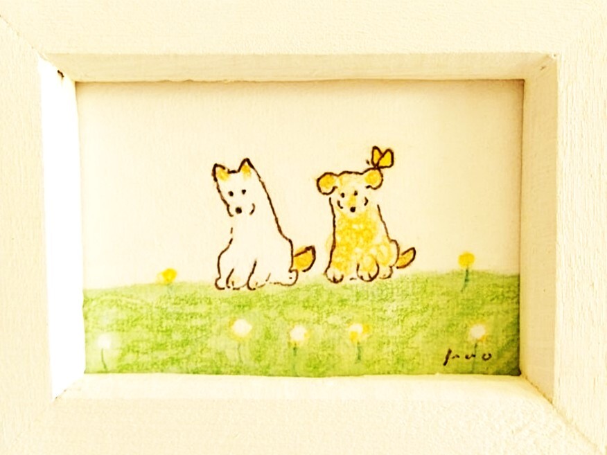 イラスト 原画 「春の一日」※木製額縁入り インテリアアート 犬のイラスト ミニ原画