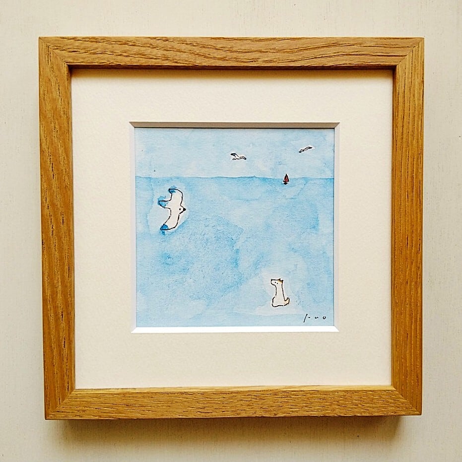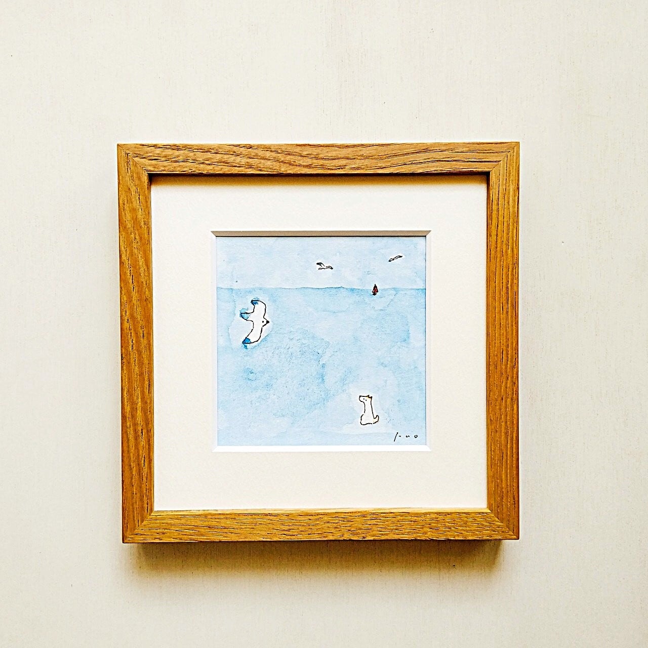 【一点物】原画「海風」 ※木製額縁入り(18㎝角)・水彩・イラスト・海・インテリアアート・送料無料