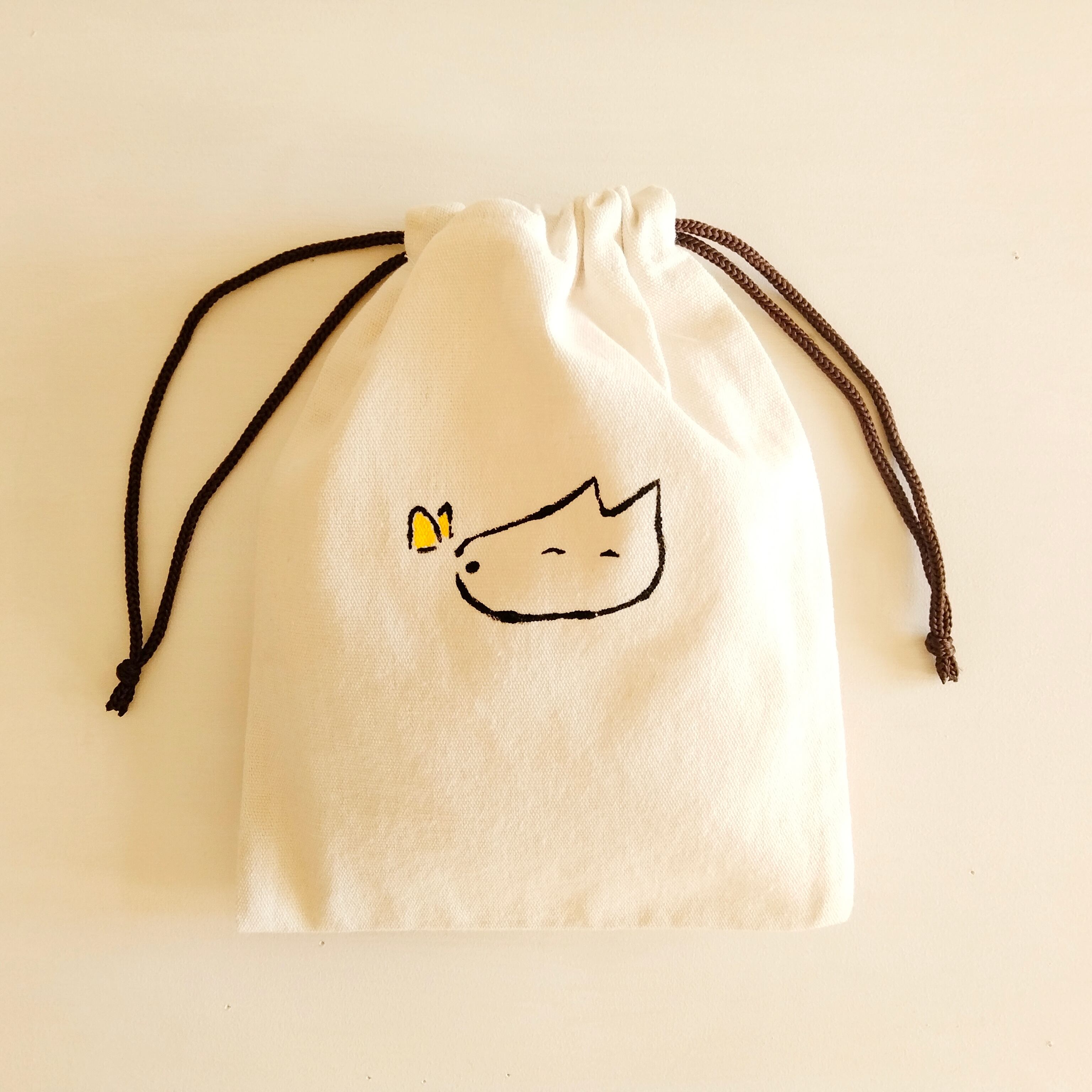 生成りの巾着ぶくろに、犬のイラストをプリントしました。