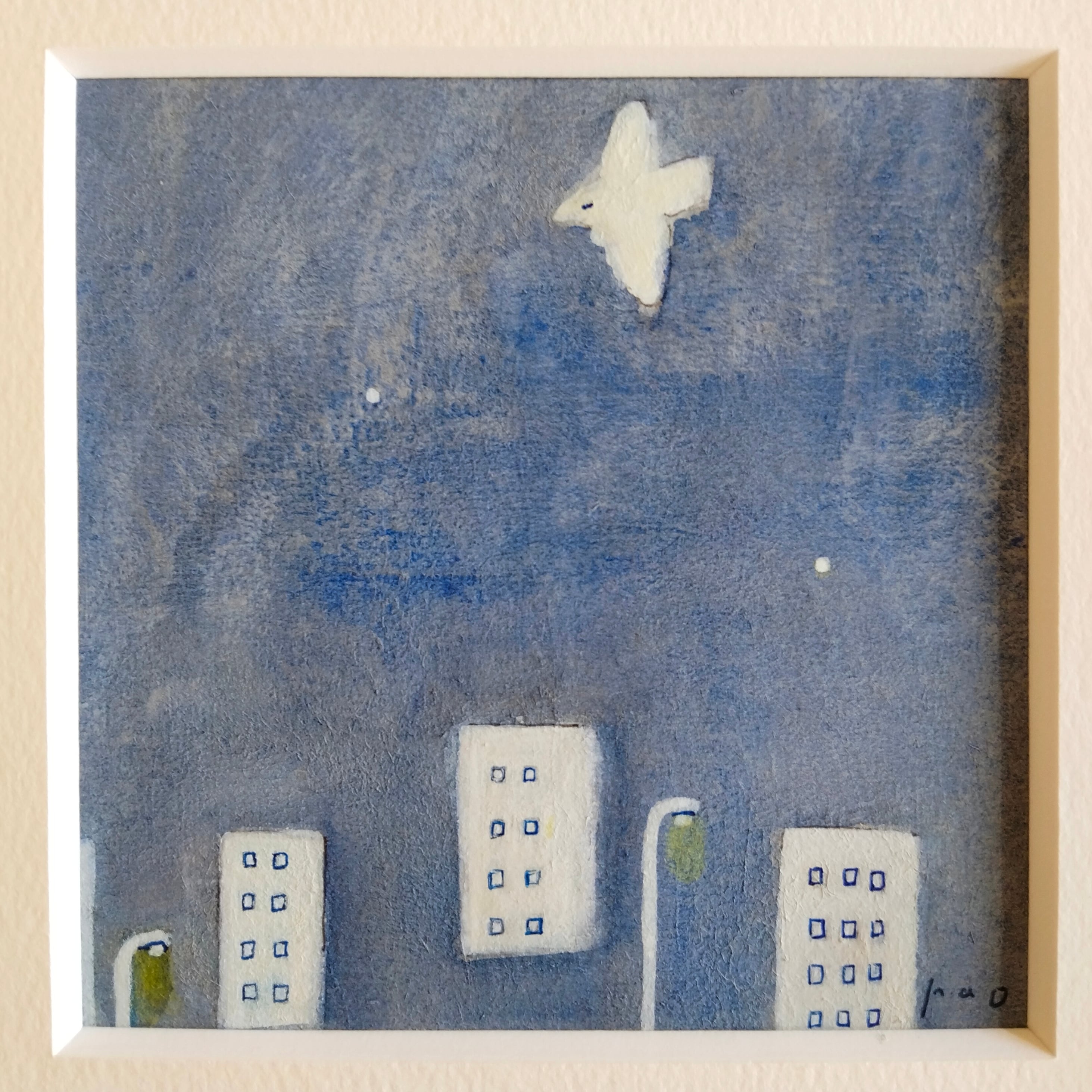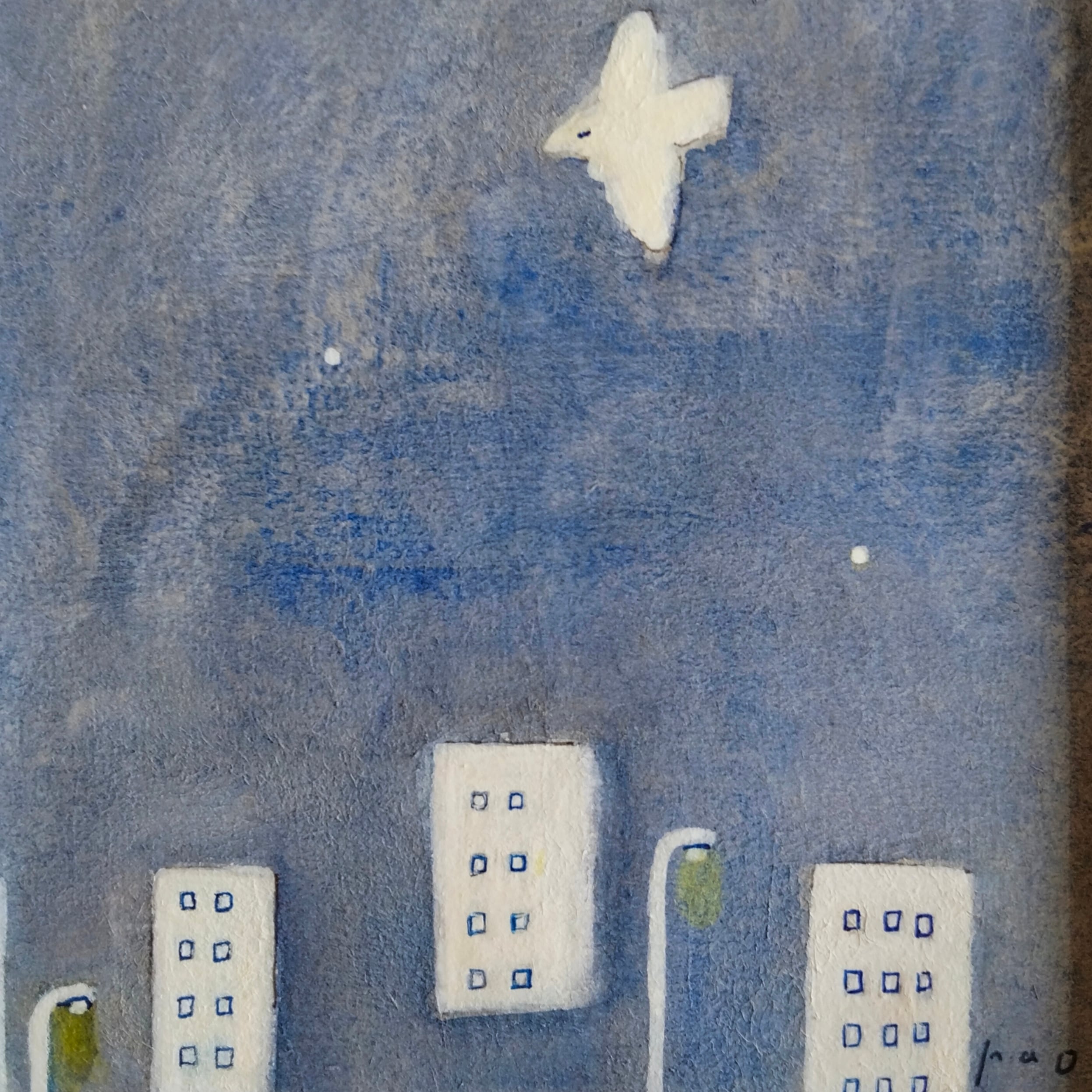 夜の街並みと、白い鳥を描いた幻想的な作品です。