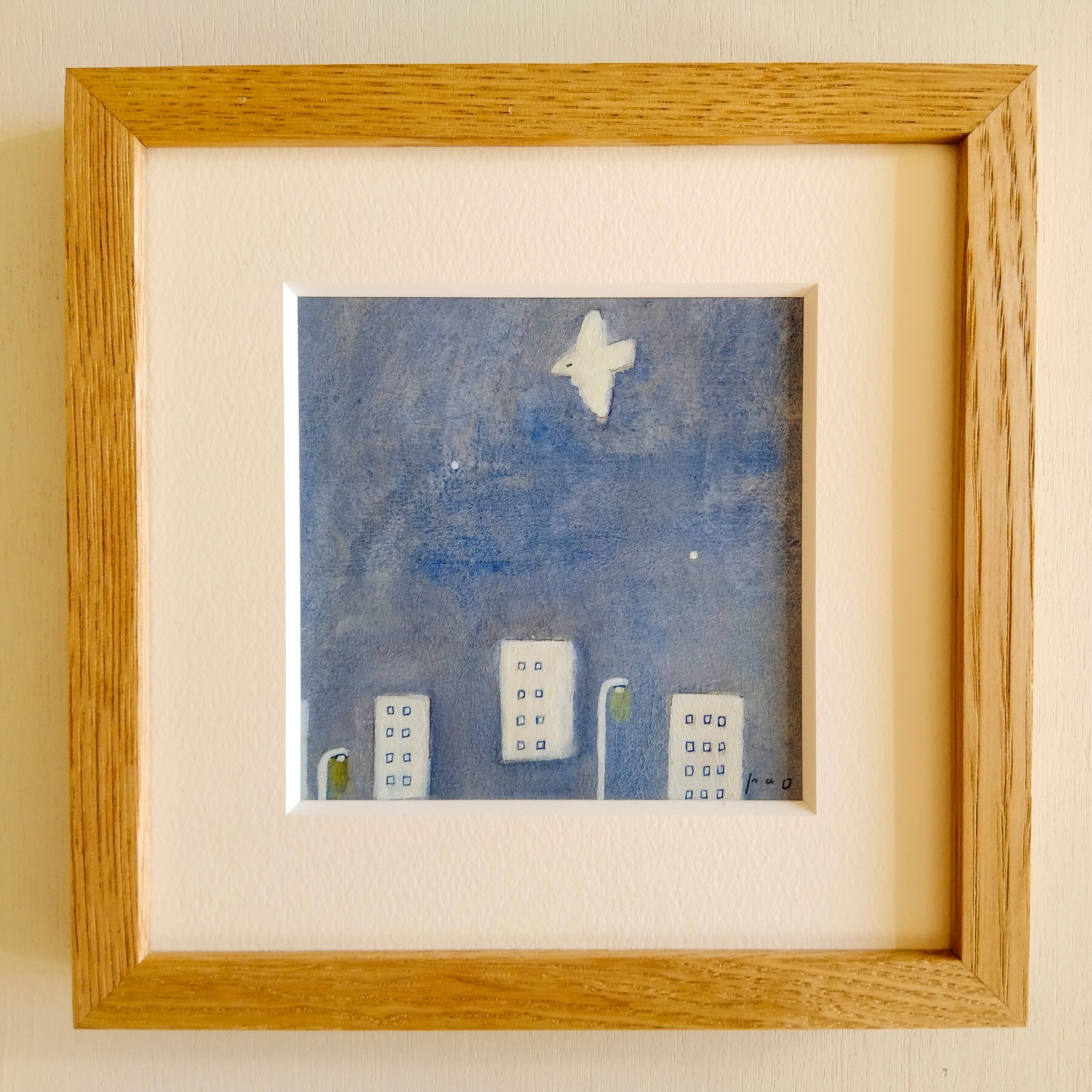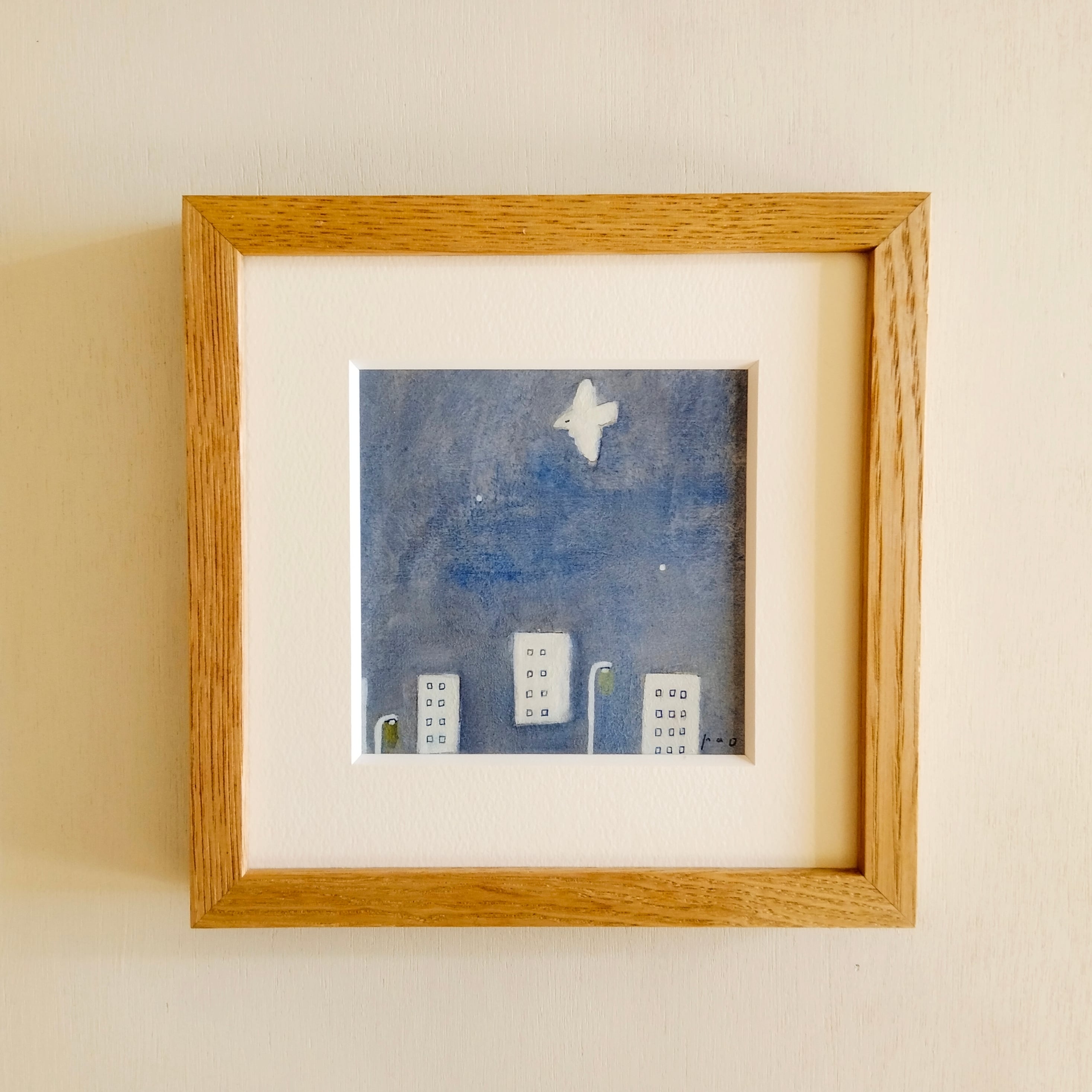 「眠る町」原画 ※木製額縁入り(18㎝角)一点物 水彩 イラスト 北欧インテリア