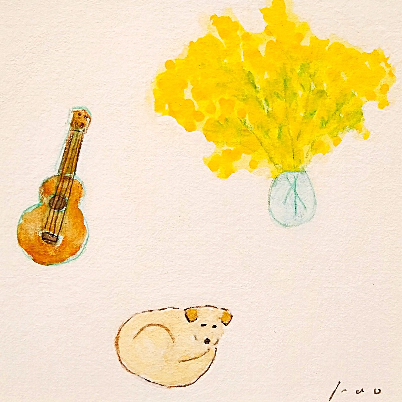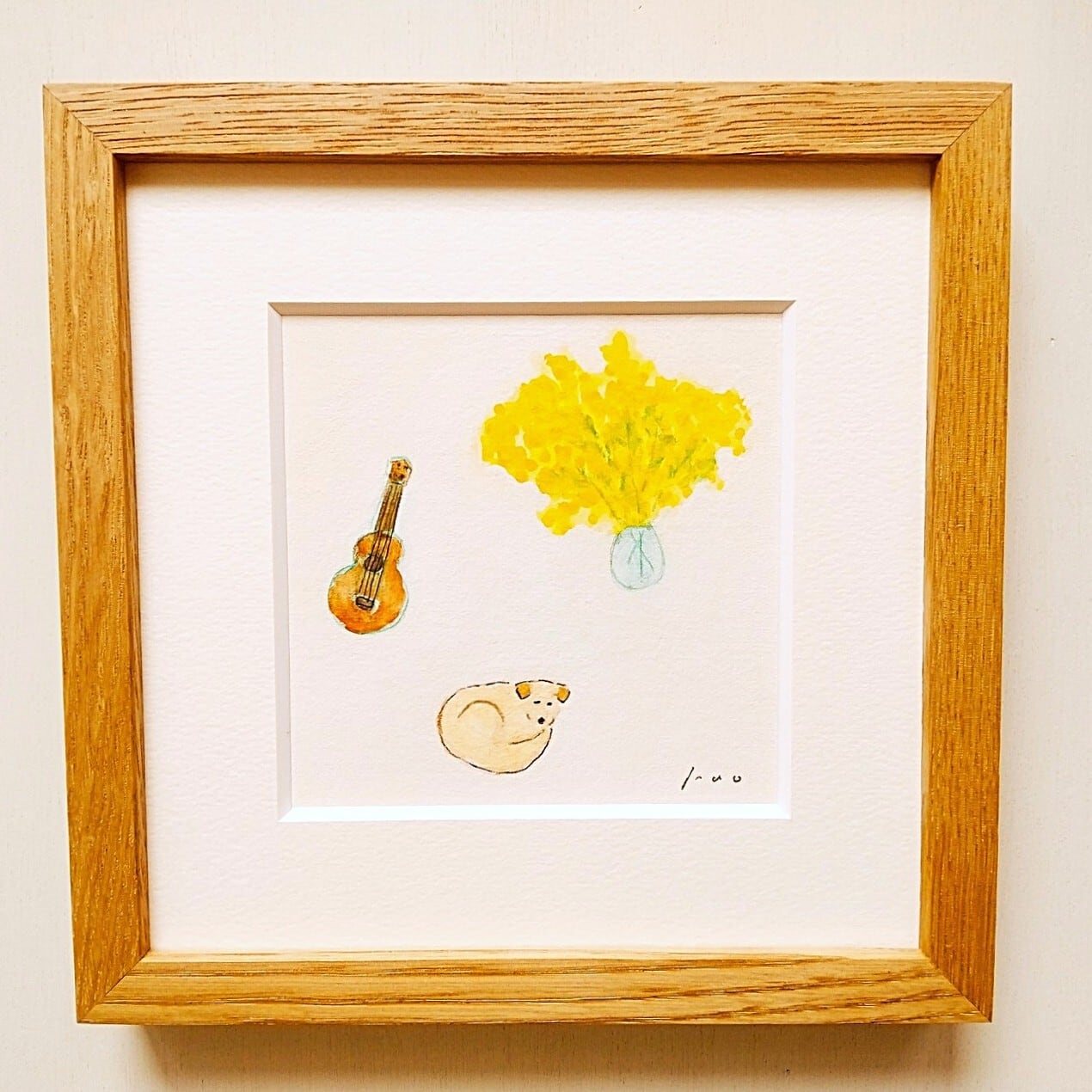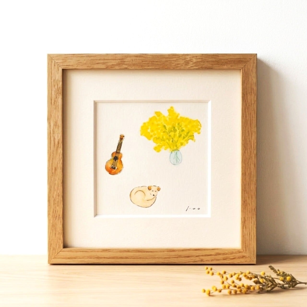 「ミモザと犬とウクレレ」原画 ※木製額縁入り(18㎝角)一点物 水彩 イラスト 北欧インテリア