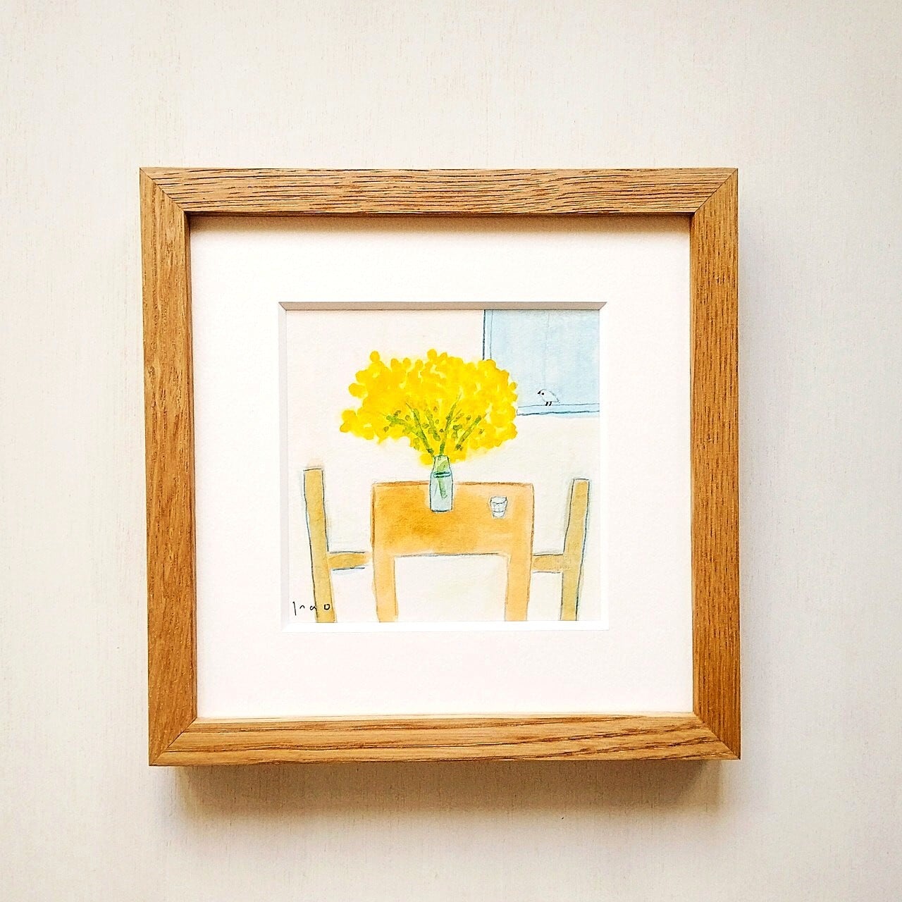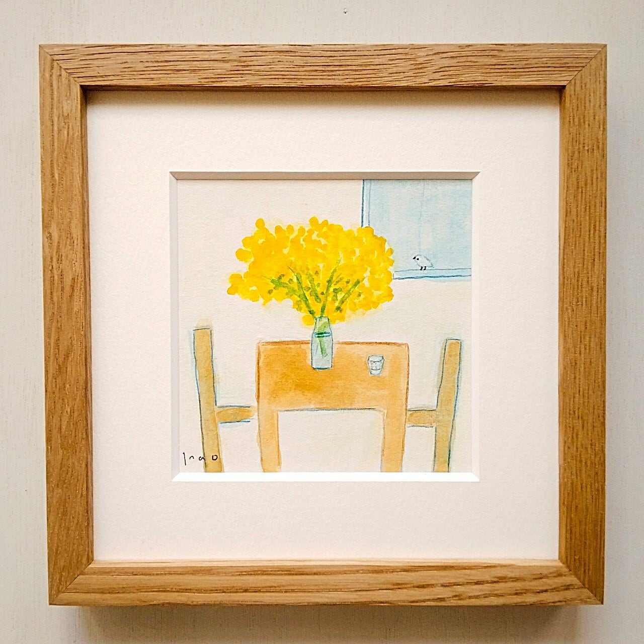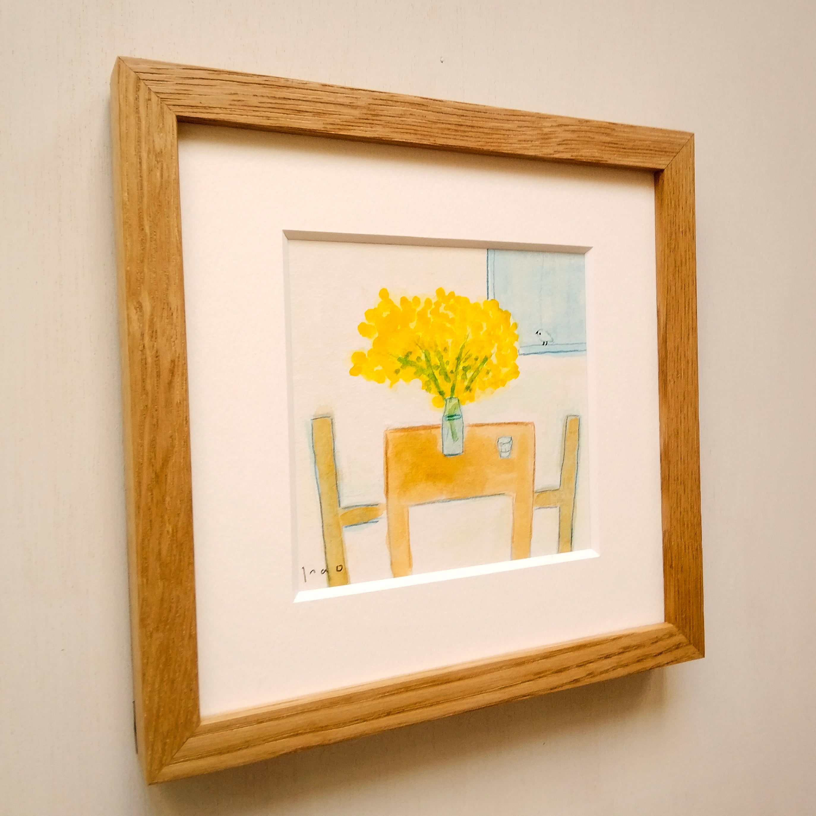 「ミモザのある部屋」原画 ※木製額縁入り(18㎝角)一点物 水彩 イラスト 北欧インテリア