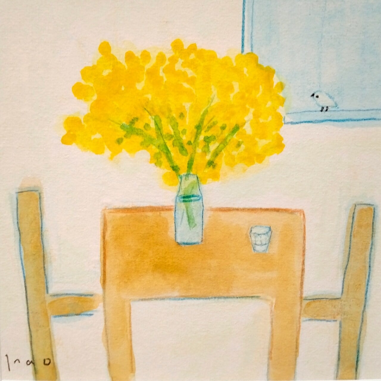 インテリア インテリアアート イラスト イラストレーター アナログイラスト 北欧インテリア 原画 手描きイラスト 一点物 風景画 鳥 ミモザ 春 春の絵 リラックス