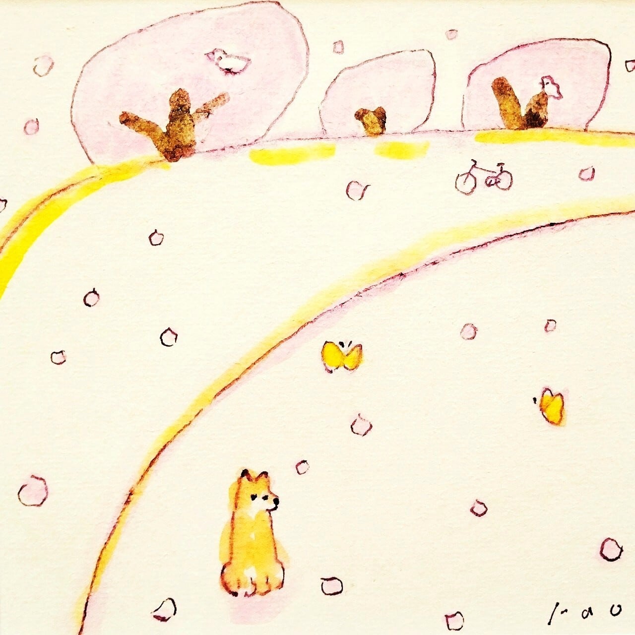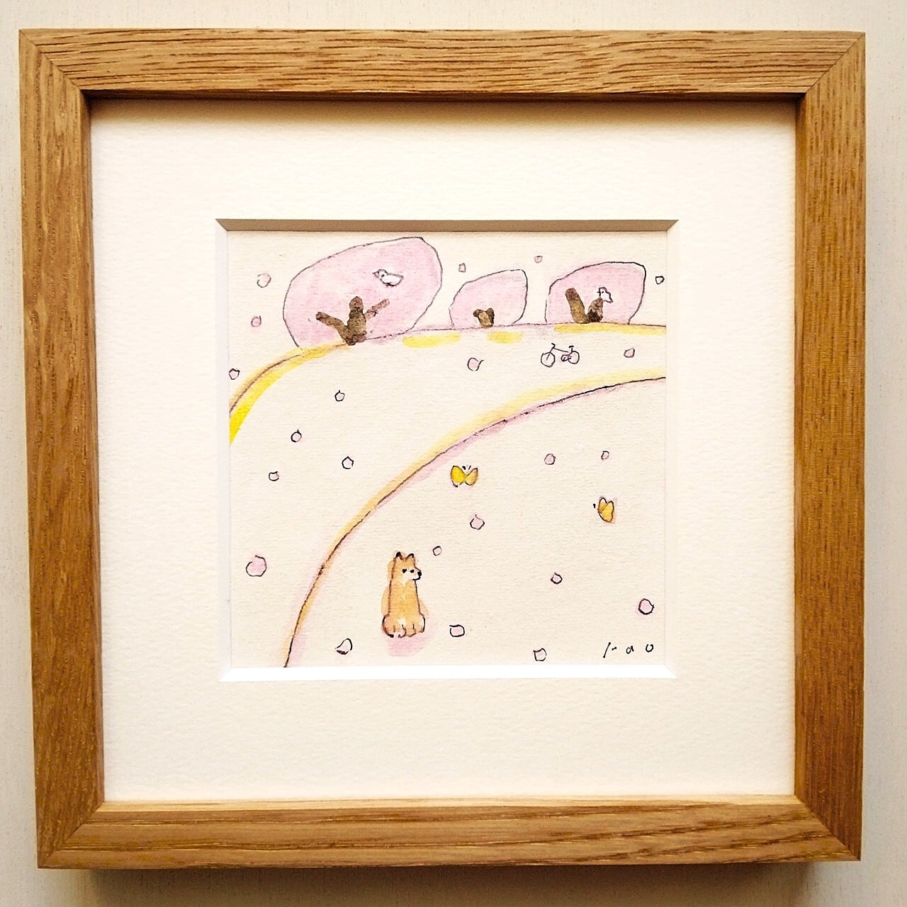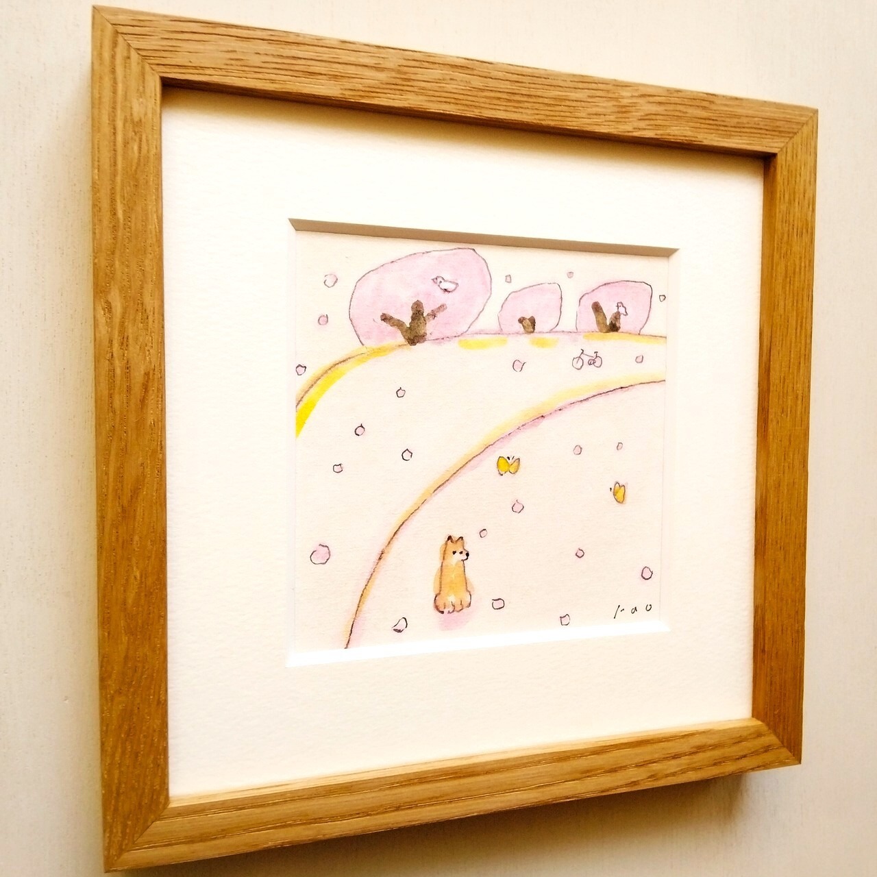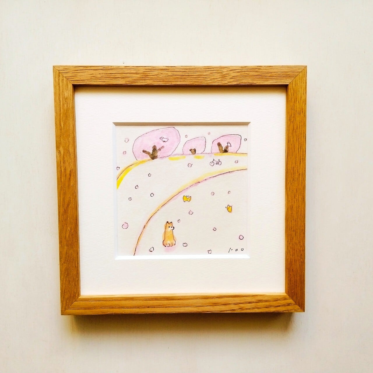 インテリア インテリアアート イラスト イラストレーター アナログイラスト 北欧インテリア 原画 手描きイラスト 一点物 風景画 桜 ピンク 春 春の絵 犬 リラックス