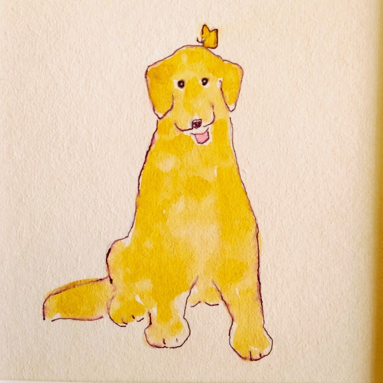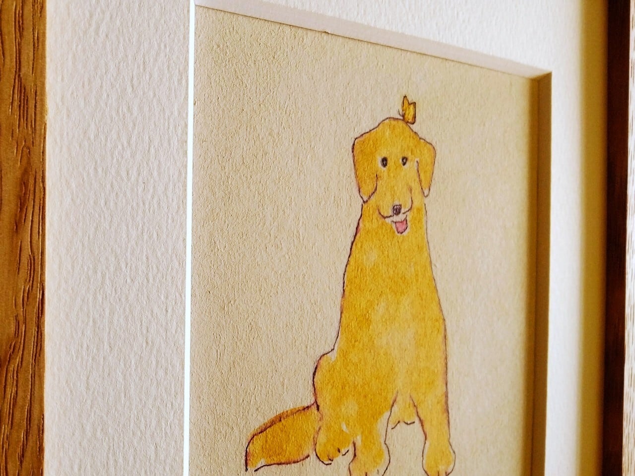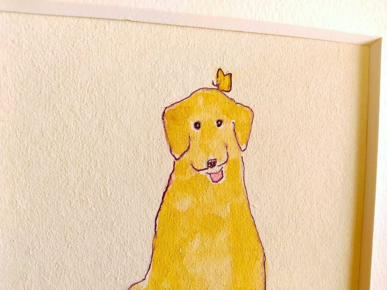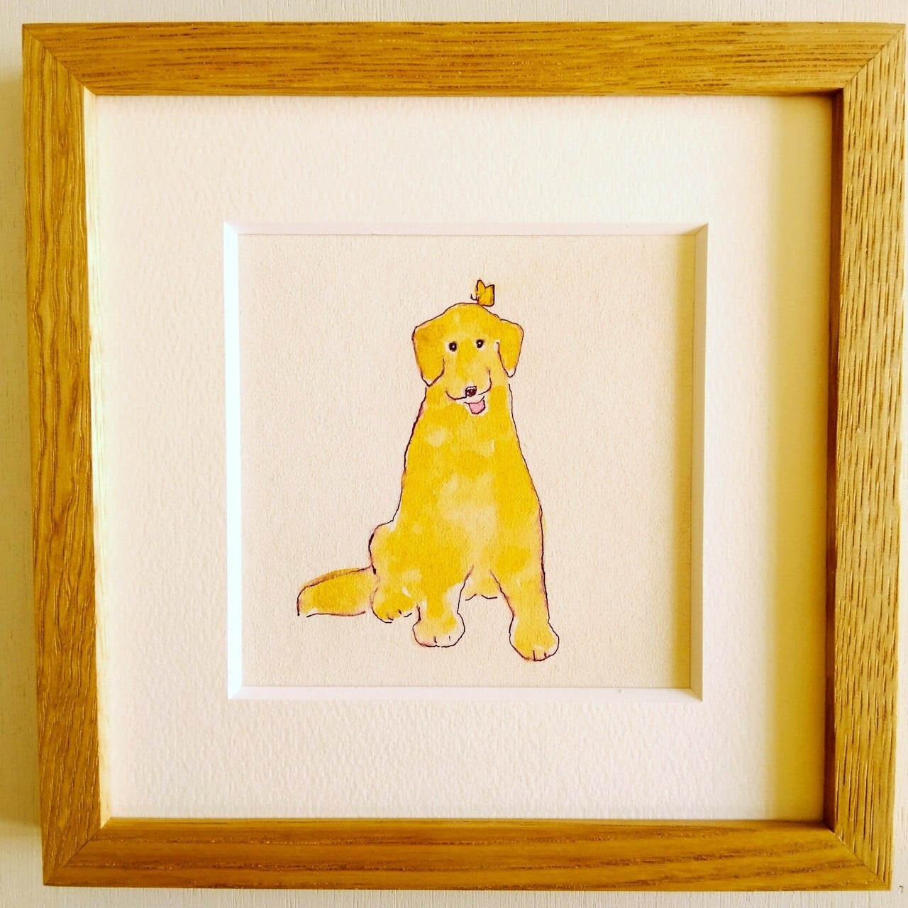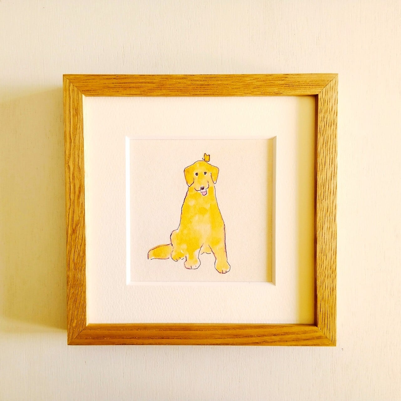 【のんきな犬に癒される】原画「犬とちょうちょ」 ※18㎝角 栗材木製額縁入り・一点物・北欧インテリア・ドローイング・ゴールデンレトリバー
