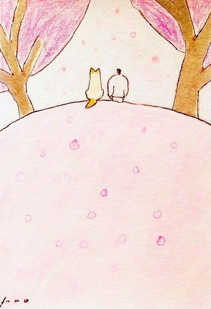 白い犬と並んで桜の木の下ですごす穏やかなひととき。