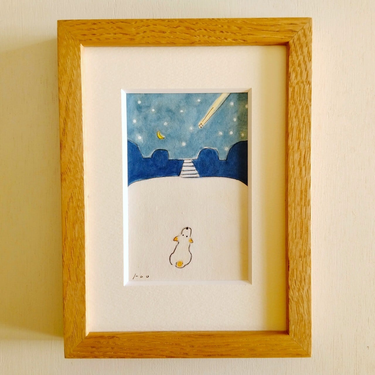 【星に願いをこめて】原画「流れ星」 ※2L木製額縁入り・水彩・インテリアアート・犬の絵
