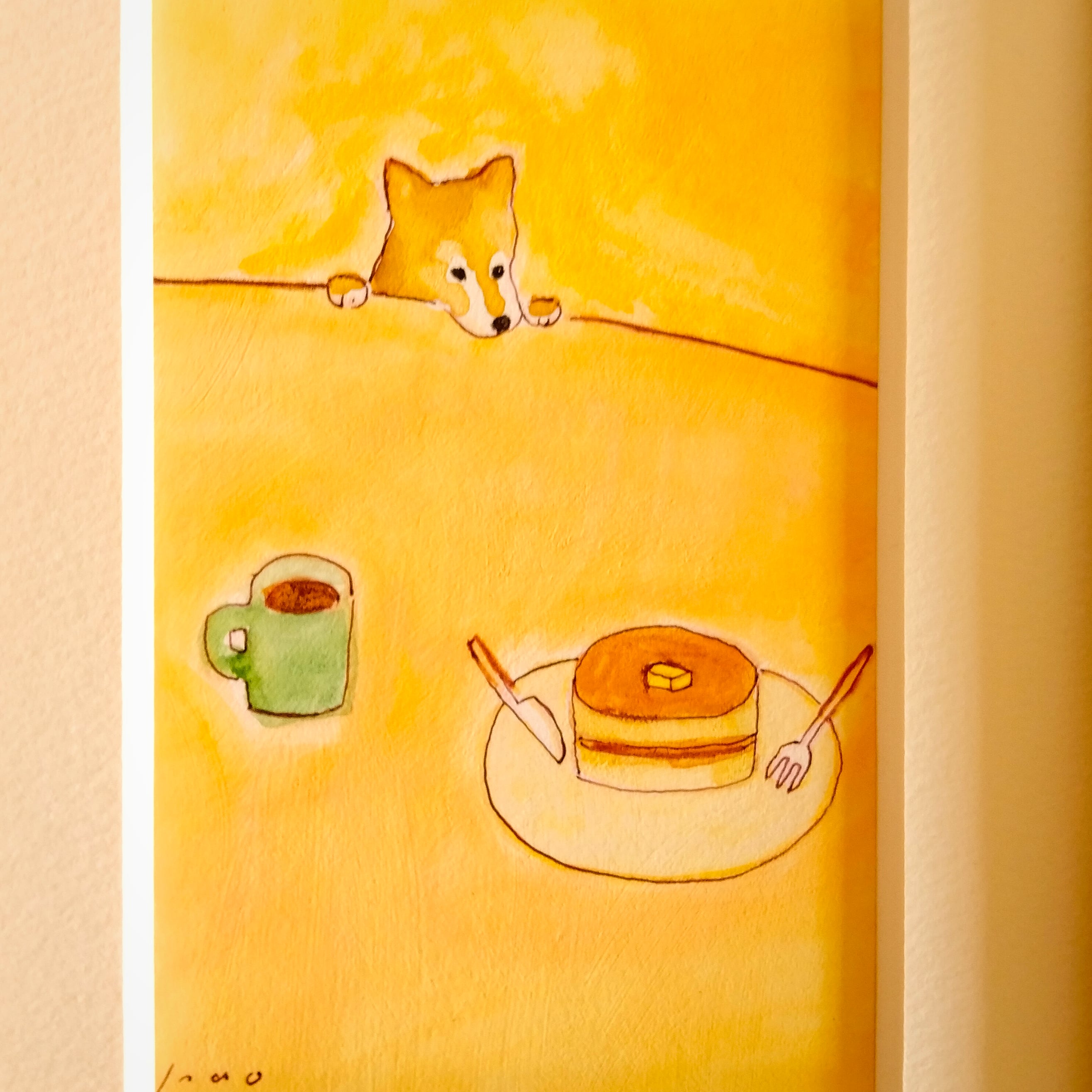 ホットケーキのいい匂いにつられ、ひょこっと柴犬が顔を出しています。