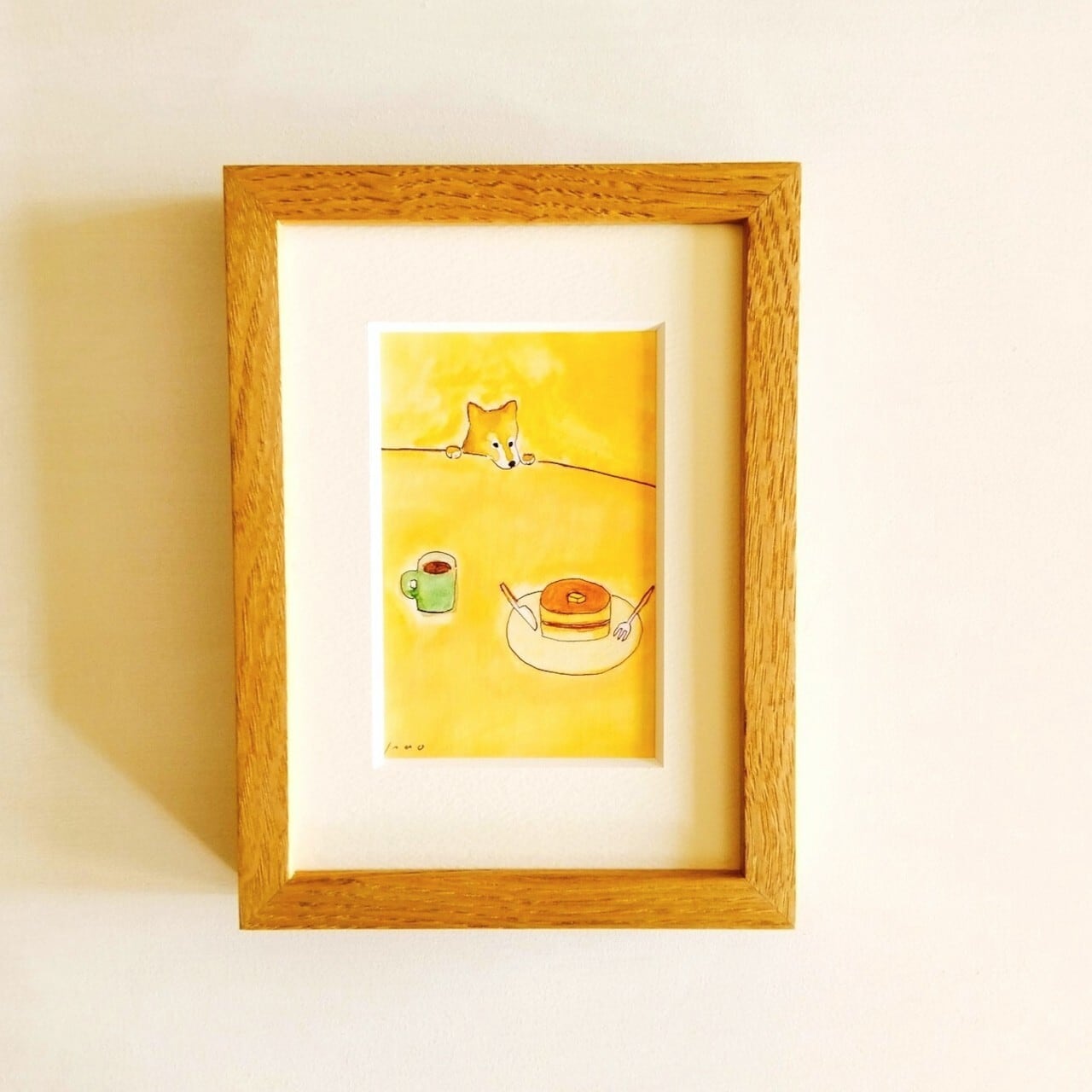 【再販】原画「ホットケーキ」 ※木製額縁入り(2Lサイズ)水彩・イラスト・インテリアアート・犬の絵・送料無料