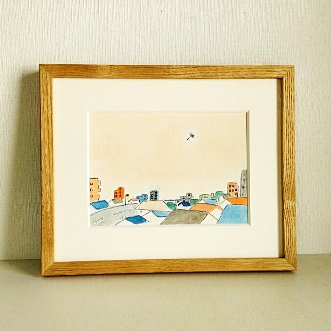 「夕方の町並み」イラスト 原画 ※木製額縁入り(インチサイズ)北欧インテリア