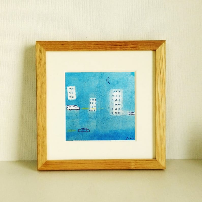 イラスト 原画「都会の夜」 ※木製額縁入り(18㎝角)インテリアアート