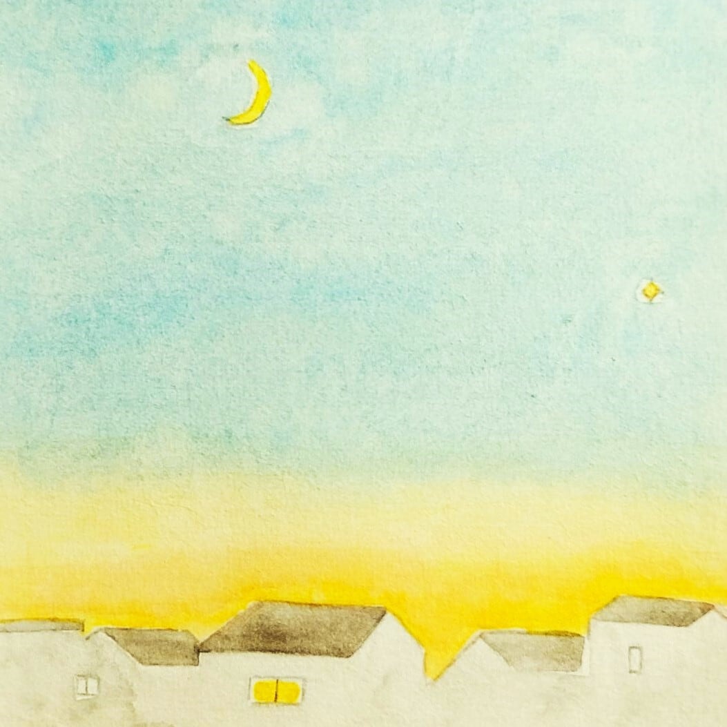 水彩絵の具の柔らかいタッチで、ライトブルーの空が淡いイエローに染まる夕暮れのひと時を描きました。