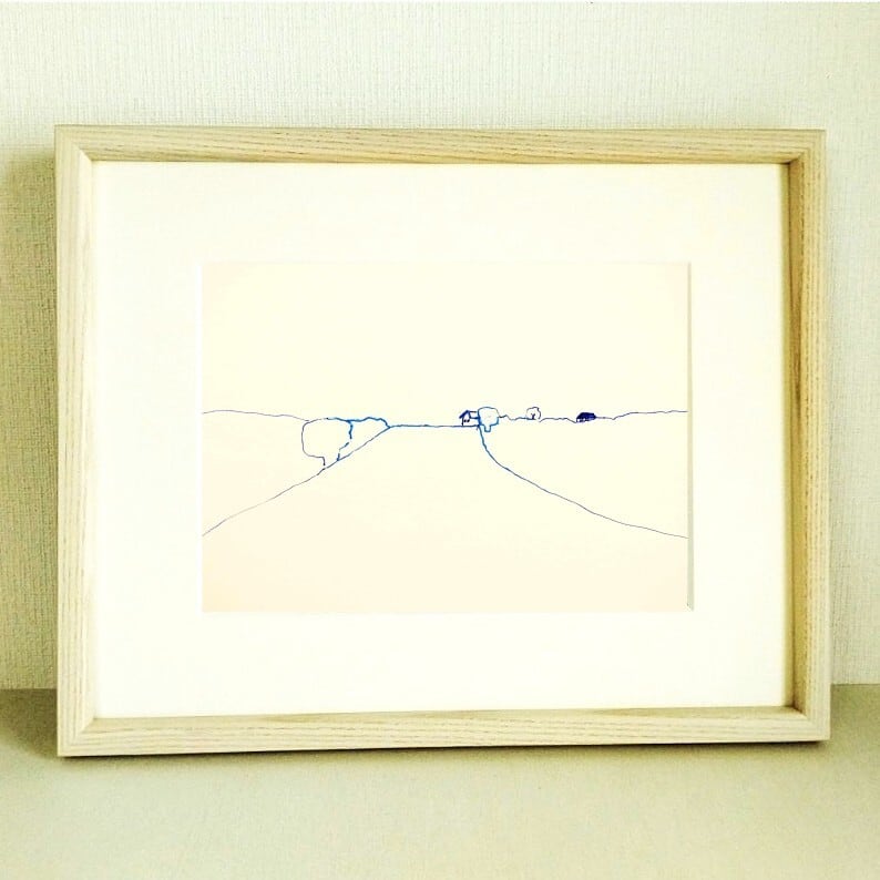 イラスト 原画「道(ドローイング)」※木製額縁入り(八つ切りサイズ)ペン画 風景画 一点物 送料無料