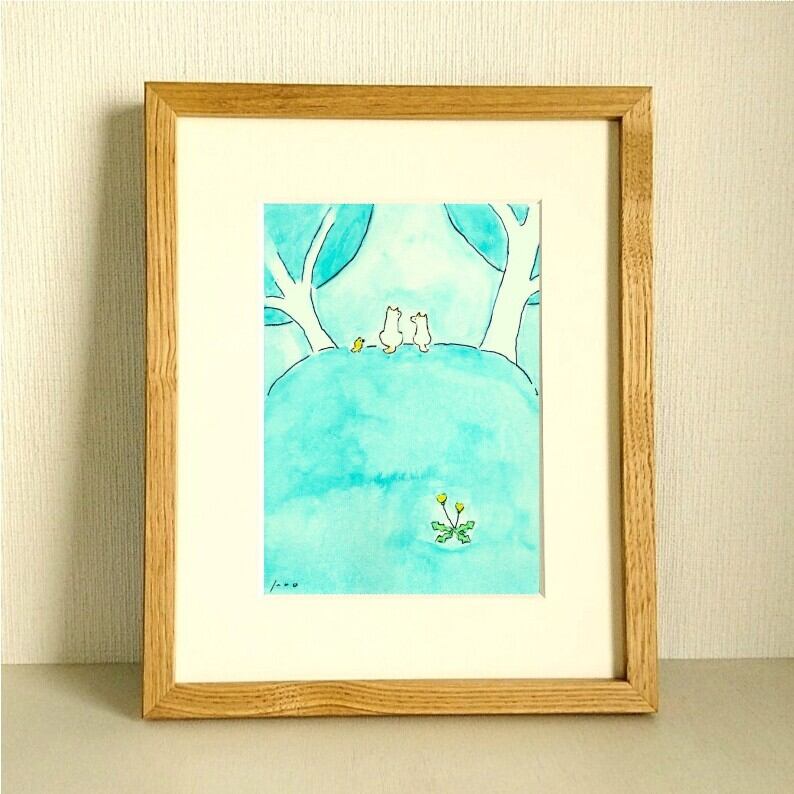 犬のイラスト「丘の上で」原画 ※木製額縁入り(+1500円でうちの子に変更が出来ます)